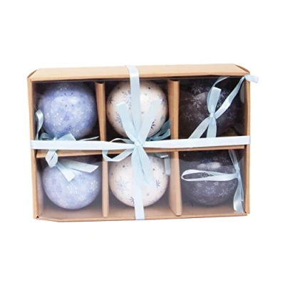 Ciao Set of 6 decoupage Christmas Tree Balls (Ø7,5cm) Snowflakes with fabric ribbon in havana giftbox