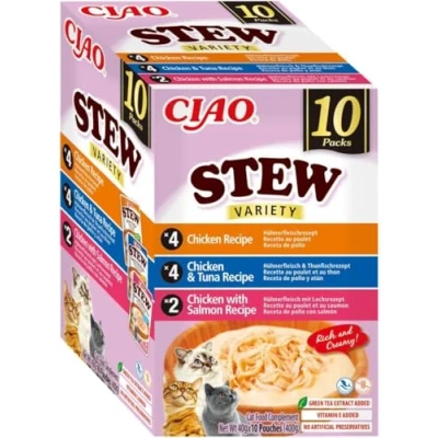 MADE WITH WHOLESOME INGREDIENTS YOU CAN TRUST: Every Inaba product is made with yummy ingredients including farm-raised chicken and/or natural wild caught tuna RICH & CREAMY: Churu Stew is a rich and creamy purée like our original Churu lickable cat treats, but with a thicker consistency that is perfect to serve as a side dish, plus we've added shreds of farm-raised chicken for added texture TASTY TOPPER: Top their meal with a luscious treat that is healthy and hydrating. Each pouch has 86% moisture and only 18.8 calories, so you can feel good about adding it to their bowl of bland dry cat food FREE FROM THE BAD STUFF: Each serving is grain-free, preservative-free, carrageenan-free and free from artificial colours, but we've added Vitamin E for your cat's immunity and Green Tea Extract as an antioxidant CONVENIENT COMPLEMENTS: These convenient individual pouches make a perfect side-dish or complement to your fur babies meal