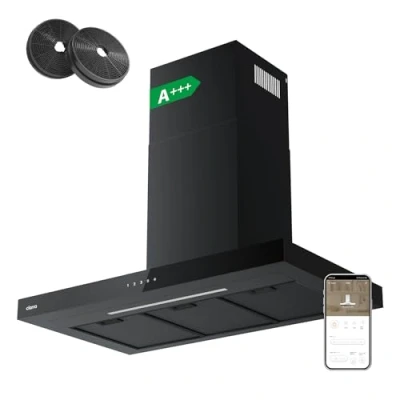 Energy Efficient Cooker Hood: This A+++ cooker hood not only reduces your annual electricity bill by 80% but also has a yearly energy consumption of only 12 kWh. 2 Ventilation Modes: The re-circulation mode cleans the air with CBCF003 carbon filters if you're unable to install ducting in your home. You can also remove odor to the outside with a 1.5m exhaust pipe in the package. WI-FI APP Touch Control: With the Wi-Fi app control, you can operate your device quickly and easily, choosing between 4 different power levels with boost function. Powerful Ventilation: Equipped with a high-performance motor, this T-shaped cooker hood delivers exceptional airflow 650m³/h, ensuring your kitchen stays smoke-free and fresh during cooking. Quiet Operation: Despite its powerful suction, this 90cm extractor hood operates quietly, maintaining a peaceful kitchen environment even during cooking.