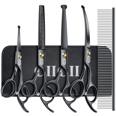 ❤️ Better Grooming Scissors, More Beautiful Life ❤️ 🔥Premium Material Grooming Scissors: ●CIICII Dog Grooming Scissors are made of titanium black coated 6CR stainless steel, All steel manufacturing - Lasting quality & Comfortable touch. ●CIICII Dog Grooming Scissors are hand-polished, the blade line is even and smooth to make the dog scissors sharper. 🐶Professional Upgrade Ergonomic Design: ❶Upgrade Larger Finger Holes - From Traditional 0.69-0.85 Inch to Upgraded 0.77-0.95 Inch based on customer recommendations. ❷Safety Round Tip - Keep pets safe, no Injured facial, not scare the pets. ❸Offset Handle Design - Very ergonomic & reduces fatigue. ❹Adjustable Screw Design - Adjust the tightness of the scissors according to our feeling. ❺High Rebound Muffler Design - Reduce the metallic noise and friction of scissors. 😺Multipurpose Pet Grooming Scissors: Equipped with the best size scissors for pet hair grooming(Length of 6.1 inch and 7.3 inch), Perfect for trimming cutting thinning grooming face, paws and body hair, thick fur, long hair and curly hair of small / large dogs, cats, rabbits, small horses, sheeps and other pets. And we can use the grooming scissors at home or pet groomer salon. 🎁Great Gift for Pet DIY Haircut: CIICII Dog Grooming Scissors come with the gift leather bag, It will be great as a gift for your family, friends and pet groomers. CIICII dog hair cutting scissors, thinning scissors and curved scissors will meet what you need (Beautiful shape, Grooming by your heart), CIICII Professional Dog Grooming Scissors are safe and easy to use for your Golden Retriever, Poodle, Alaska, Husky, Collie, Labrador, Corgi and other dogs, cats and pets. ✨Practical 10-In-1 Dog Grooming Kit: ●6.1 Inch Straight Cutting Scissors ●7.3 Inch Straight Cutting Scissors ●7.3 Inch Down-curved Grooming Scissors ●7.3 Inch Hair Thinning Scissors ●6.5 Inch Dog Grooming Comb ●Gift Leather Bag (Attached Gifts ☛2 × Hair Clips, 1 × Cleaning Cloth, 1 × Scissors Adjuster). ❤️90-DAYS Unconditional Return + 365-DAYS Promise for any quality-related issues, CIICII professional customer team will handle your issues and help you in 12 hours.