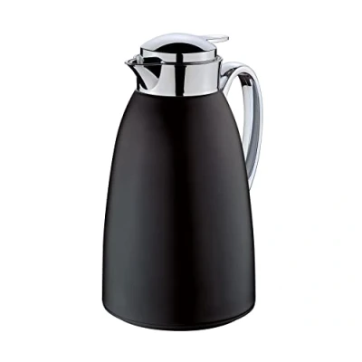 Stainless steel insulated beverage server with tempered glass liner; matte black satin finish 34 ounce/ 1 liter capacity; hard tempered glass insert Screw-on closure with convenient easy-touch button; one-hand spout Keeps liquid hot up to 12 hours or cold up to 24 hours Hand washing recommended