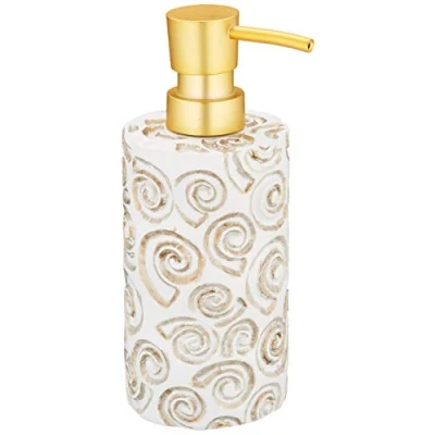 composed of white resin with gold circular decorations gold color pump dispenses the right amount of soap to use Do not use aggressive cleaning products, we recommend a neutral detergent and a soft cloth