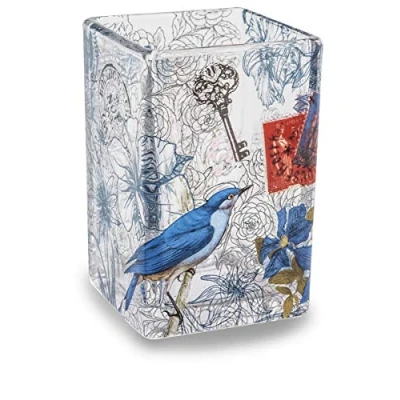 enamel decorated clear glass bathroom accessory Can be used as a toothbrush holder or bath glass Do not use aggressive cleaning products, we recommend a neutral detergent and a soft cloth