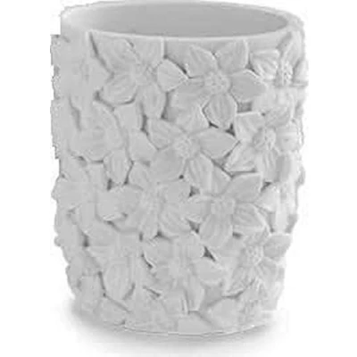 white resin glass with floral decorations Embossed resin flowers, perfect to always have spring in your bathroom! Useful as a toothbrush holder Do not use aggressive cleaning products, we recommend a neutral detergent and a soft cloth
