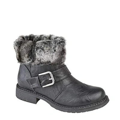 AmazonLadies biker style boots Fold down faux fur collar Buckle strap detail Memory foam insole and textile lining Button stud fastening