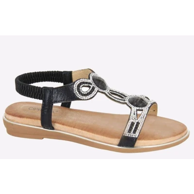 Slip into dazzling style with these Cipriata Desia women's sandals, boasting a sleek black design, with jewelled detailing, and a comfortable microfibre footbed for added comfort. - PU/Jewel upper- Elasticated back for easy slip-on wear - Microfibre sockliner - Jewelled design for visual appeal - TPR Sole