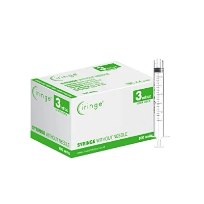 CE MARK: Manufactured according to European Stands MDD 93/42/EEC and has the CE Mark CLEAR READING: High clarity barrel, exact and long lasting graduation marks printed on the barrel SMOOTH MOVEMENT: Latex free piston, lubricated with silicon for a smooth draw. Internal ring in barrel acts as a lock to ensure plunger does not displace during draw STERILE: Sterilization by ETO and individually blister packed This pack contains: 100 x 3ml lock disposable syringes