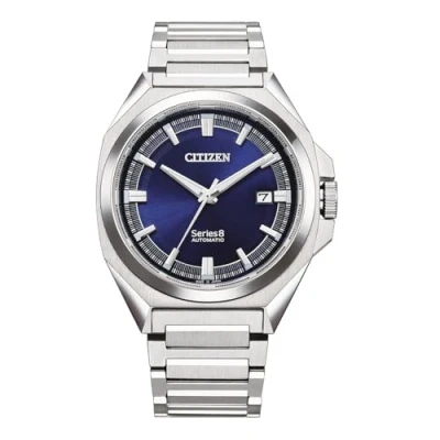 The Citizen Series 8 Mechanical Collection offers modern timepieces for a modern world. The sporty designs with powerful automatic movements make a strong impression. This Analogue watch features a calendar function: Date and is equipped with Luminous Hands and Luminous Numbers Premium Silver Stainless steel strap, measuring 21 cm in length and 21 mm in width, with a Fold over with push button clasp. Case diameter: 40 mm,case thickness: 10 mm, case colour: Silver and dial colour: Blue Water resistant: United Watch Trading N.V., uk_watches, UNILY-Weight: No g The watch is delivered in an original gift box and has a warranty of 2 years
