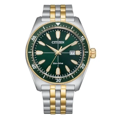 GENTS ECO-DRIVE BRACELET A timeless design with distinguished features sure to stand out on your wrist, discover the Men's Sport. This stylish watch is featured in a two-tone stainless steel case with pine green dial and bezel, two-tone stainless steel bracelet and date display. FEATURES:A 43mm two tone stainless Steel case & bracelet, green dial and bezel, Date display LIGHT POWERED ECO-DRIVE: Converts any light, whether natural or artificial, into energy. Energy is stored in a permanently rechargeable power cell. The watch recharges continuously in any light to run forever, with no battery changes required. UK APPROVED SUPPLIER: Comes With a 5-year Citizen UK warranty.