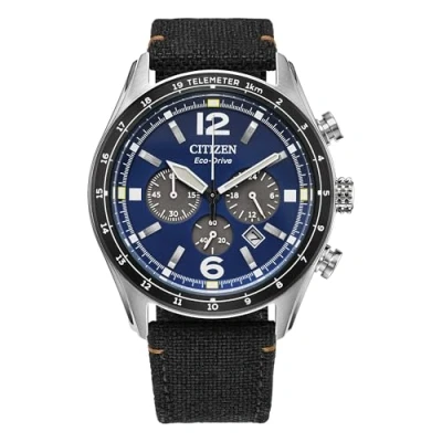 GENTS ECO-DRIVE CHRONOGRAPH This sporty chronograph from Citizen is styled in stainless steel with a bold blue dial and black nylon strap. Equipped with the calibre B620 and Citizen's Eco-Drive technology, this chronograph offers a 24-hour display, date display, stopwatch function, power reserve. FEATURES:A 43mm stainless steel case, blue dial and black nylon strap. Chronograph with 24 hour display , stopwatch, power reserve and Date display LIGHT POWERED ECO-DRIVE: Converts any light, whether natural or artificial, into energy. Energy is stored in a permanently rechargeable power cell. The watch recharges continuously in any light to run forever, with no battery changes required. UK APPROVED SUPPLIER: Comes With a 5-year Citizen UK warranty.