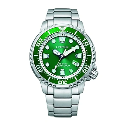 GENTS ECO-DRIVE PROMASTER WR200 Proof that a dive watch can be fun and functional with Citizen ISO compliant Promaster Diver. With Eco-Drive technology, it is powered by light and never needs a battery. Featuring a one way rotating elapsed time bezel and screw down crown. It is stylishly understated with its dazzling green dial and bezel. It will let you reach your limits and provide your life with the adventure you are searching for. FEATURES:A 47mm stainless steel case & bracelet, ISO compliant, one way rotating elapsed time bezel, screwdown crown. Green dial, LIGHT POWERED ECO-DRIVE: Converts any light, whether natural or artificial, into energy. Energy is stored in a permanently rechargeable power cell. The watch recharges continuously in any light to run forever, with no battery changes required. UK APPROVED SUPPLIER: Comes With a 5-year Citizen UK warranty.