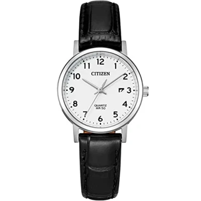 This Citizen Analogue Watch for Women is the perfect timepiece to wear or to gift. It's Silver 28 mm Round case combined with the comfortable Black Leather will ensure you enjoy this stunning timepiece without any compromise. Operated by a high quality Quartz movement and water resistant to 5 bars, your watch will keep ticking. This classic watch is a perfect gift for New Year, birthday,valentine's day and so on -The watch has a calendar function: Date High quality 19 cm length and 13 mm width Black Leather strap with a Fold over with Buckle Case diameter: 28 mm,case thickness: 7 mm, case colour: Silver and dial colour: White