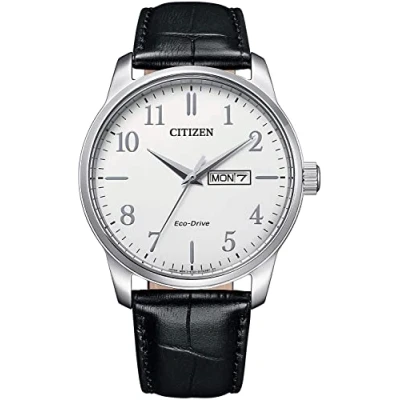 This Citizen Analogue Watch for Men is the perfect timepiece to wear or to gift. It's Silver 41 mm Round case combined with the comfortable Black Leather will ensure you enjoy this stunning timepiece without any compromise. Operated by a high quality Eco-Drive movement and water resistant to 10 bars, your watch will keep ticking. This high quality watch has an Eco-drive technology (Recharged by any light source; no need for ever a battery) - The watch has a Calendar function: Day-Date, Solar Powered High quality 21 cm length and 21 mm width Black Leather strap with a Buckle Case diameter: 41 mm,case thickness: 10 mm, case colour: Silver and dial colour: White
