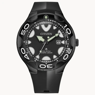 Secret SalesThis Citizen Promaster Orca Analogue Watch for Men is the perfect timepiece to wear or to gift. It's Black 45 mm Round case combined with the comfortable Black Polyurethane watch band will ensure you enjoy this stunning timepiece without any compromise. Operated by a high quality Eco-Drive movement and water resistant to 20 bars, your watch will keep ticking. ECO-DRIVE - Eco-Drive is a 40-year-old core technology from CITIZEN that generates power even in dim light, allowing watches to run for over six months even in the dark. This Analogue watch has a clendar function: Date, Solar Powered, Luminous Hands, Luminous Numbers and Screw Down Crown High quality 21 cm length and 24 mm width Black Polyurethane strap with a Buckle Case diameter: 45 mm,case thickness: 14 mm, case colour: Black and dial colour: Black