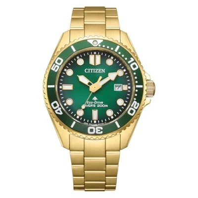This high quality watch has an Eco-drive technology (Recharged by any light source; no need for ever a battery). This Analogue watch features a calendar function: Date and is equipped with Solar Powered , Luminous Hands and a Luminous Numbers High quality Gold Stainless steel strap, measuring 21 cm in length and 19 mm in width, with a Fold over with push button clasp. Case diameter: 41 mm,case thickness: 11 mm, case colour: Gold and dial colour: Green Water resistant: 20 bars-Weight: 150 g The watch is delivered in an original gift box and has a warranty of 2 years