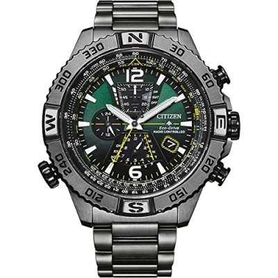 This high quality watch has an Eco-drive technology (Recharged by any light source; no need for ever a battery) and a power reserve indicator -The watch has a calendar function: Date, Radio Controlled, Solar Powered, Stop Watch, 24-hour Display, Luminous Hands High quality 21 cm length and 21 mm width Grey Stainless steel strap with a Fold over with push button clasp Case diameter: 48 mm,case thickness: 12 mm, case colour: Grey and dial colour: Green Water resistant: 20 bars -Weight: 195 g The watch is delivered in an original gift box and has a warranty of 2 years