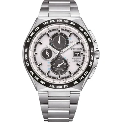 This high quality watch has an Eco-drive technology (Recharged by any light source; no need for ever a battery). This Chronograph watch has a calendar function: Date , Radio Controlled , Solar Powered , Stop Watch , 24-hour Display and Luminous Hands High quality 21 cm length and 22 mm width Silver Titanium strap with a Fold over with push button clasp Case diameter: 44 mm,case thickness: 10 mm, case colour: Silver and dial colour: White Water resistant: 10 bars -Weight: 89 g The watch is delivered in an original gift box and has a warranty of 2 years
