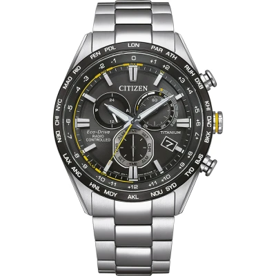 This Citizen Chronograph Watch for Men is the perfect timepiece to wear or to gift. It's Silver 42 mm Round case combined with the comfortable Silver Titanium watch band will ensure you enjoy this stunning timepiece without any compromise. Operated by a high quality Eco-Drive movement and water resistant to 10 bars, your watch will keep ticking. This high quality watch has an Eco-drive technology (Recharged by any light source; no need for ever a battery) -The watch has a calendar function: Date, Radio Controlled, Solar Powered, Stop Watch, Worldtime, Luminous Hands High quality 21 cm length and 21 mm width Silver Titanium strap with a Fold over with push button clasp Case diameter: 42 mm,case thickness: 12 mm, case colour: Silver and dial colour: Black