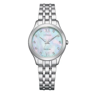 LADIES ECO-DRIVE DIAMOND DIAL Add the perfect about of sparkle to your watch collection with the Silhouette Diamond, featuring 10 diamonds delicately handset on a Mother-of-Pearl dial. This timepiece will seamlessly fit into your wardrobe with its stylish stainless-steel bracelet. FEATURES:A 29mm stainless steel case & bracelet , 10 diamonds on mother of pearl dial. LIGHT POWERED ECO-DRIVE: Converts any light, whether natural or artificial, into energy. Energy is stored in a permanently rechargeable power cell. The watch recharges continuously in any light to run forever, with no battery changes required. UK APPROVED SUPPLIER: Comes With a 5-year Citizen UK warranty.