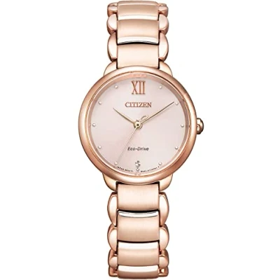This high quality watch has an Eco-drive technology (Recharged by any light source; no need for ever a battery) -The watch has a function: Solar Powered High quality 19 cm length and 15 mm width Rose Gold Stainless steel strap with a Deployment clasp Case diameter: 28 mm,case thickness: 8 mm, case colour: Rose Gold and dial colour: Rose gold Water resistant: 5 bars -Weight: 68 g The watch is delivered in an original gift box and has a warranty of 2 years