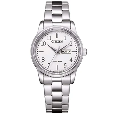 Go green with this solar powered watch recharges itself in any kind of light,This solar watch does not require any battery replacement. -The watch has a calendar function: Day-Date, Solar Powered High quality 19 cm length and 15 mm width Silver Stainless steel strap with a Fold over with Fold over with push button clasp Case diameter: 31 mm,case thickness: 9 mm, case colour: Silver and dial colour: White Water resistant: 10 bars -Weight: 75 g The watch is delivered in an original gift box and has a warranty of 2 years