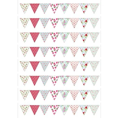 Vintage Flower themed bunting printed onto edible icing sheet with edible inks Featuring a range of different colour flowers - You will receive 49 triangles, each one approx 2.5cm width x 2.5cm Printed on Decor Paper Plus Edible icing Sheet This bunting is supplied on an A4 icing sheet and will require cutting out and arranging on your cake Fully Edible Decor Sheet Ingredients - E1422,E1412,Maltodextrin,Humectant E422, Sugar, Water, Stabilizers E414,E460i, Dextrose, Emulsifiers E435, E491, E471, Food Colour, Flavours, Acidity Regulator E3330, Preservative E202, Sucralose.