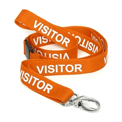 High-quality pre-printed Visitor Lanyards with safety breakaway release and premium metal clip, to be worn around the neck to carry a staff ID, access cards Size: 1.5cm Width, half-length is 51cm Note:51cm refers to the length of the lanyard folded in half together with the length of the Lobster clasp below Metal clip and breakaway Please select colour and pack size Pre-Printed in bold text as pictured