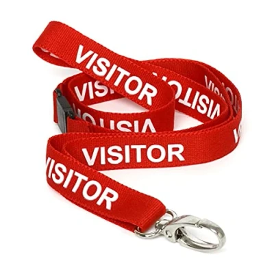 High-quality pre-printed Visitor Lanyards with safety breakaway release and premium metal clip, to be worn around the neck to carry a staff ID, access cards Size: 1.5cm Width, half-length is 51cm Note:51cm refers to the length of the lanyard folded in half together with the length of the Lobster clasp below Metal clip and breakaway Please select colour and pack size Pre-Printed in bold text as pictured