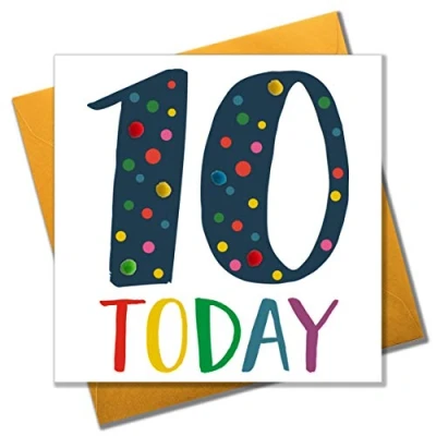 Wording on Front - 10 TodayBlank inside for your own message Comes cello wrapped in Compostable bag with a vibrant yellow envelope Part of the Pompom range. Printed and hand finished in the U.K with beautiful colourful pompom embellishments.