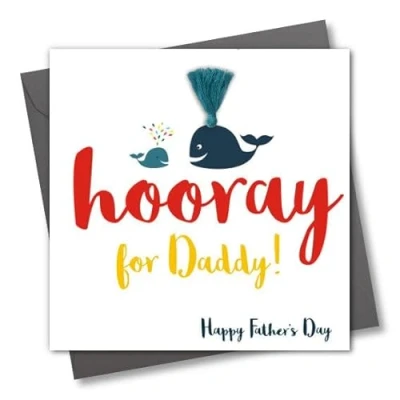 HIGH-QUALITY AND SUSTAINABLE: These 150mm x 150mm cards are printed on top quality heavy sustainable card stock. Both the greetings card & envelope are recyclable. CAPTION: Hooray for Daddy! Happy Father's Day MADE IN THE UK: Designed, printed and finished in the UK, and embellished with colourful pompoms. BLANK INSIDE FOR YOUR HAND-WRITTEN MESSAGE: These cards have plenty of blank space inside, making it easy to add your own hand-written messages. ENVELOPE INCLUDED AND COMPOSTABLE POLYBAG: They come complete with a quality envelope, and individually wrapped in a biodegradable compostable poly bag. Can be sent with Royal Mail standard letter stamps