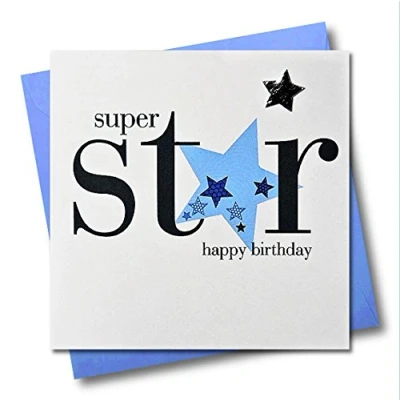 Claire Giles Greeting Cards, Happy Birthday Card, Blue Stars design, Super Star, Embellished with a padded star