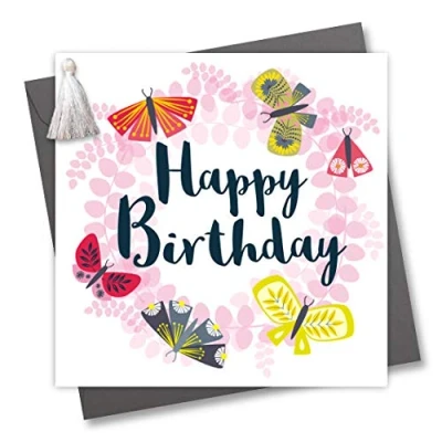 Claire Giles Greeting Cards, Happy Birthday Card, Butterfly Wreath Design Embellished with a Colourful Tassel