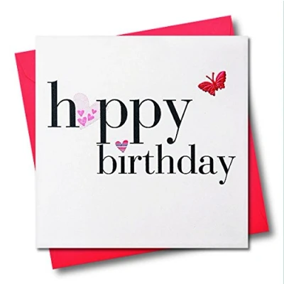 DIMENSIONS: 150x150mm CAPTION: Happy Birthday EMBELLISHMENT: Fabric Pink Butterfly BLANK INSIDE: Space inside for your own message MADE IN THE UK: Designed, printed and finished in the UK HIGH-QUALITY: Printed on top quality heavy 350gsm card stock, with envelope included SUSTAINABLE: Comes wrapped in Compostable bag or with a card catch label. Both the greetings card & envelope are sustainably sourced and recyclable STANDARD LETTER SIZE: Can be sent with Royal Mail standard letter stamps