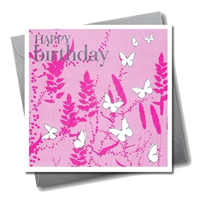 Claire Giles Greeting Cards, Happy Birthday Card, Pink Card with Butterflies in grass design, Embossed and Foiled text