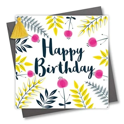 DIMENSIONS: 150x150mm CAPTION: Happy Birthday EMBELLISHMENT: Yellow Tassel BLANK INSIDE: Space inside for your own message MADE IN THE UK: Designed, printed and finished in the UK HIGH-QUALITY: Printed on top quality heavy 350gsm card stock, with envelope included SUSTAINABLE: Comes wrapped in Compostable bag or with a card catch label. Both the greetings card & envelope are sustainably sourced and recyclable STANDARD LETTER SIZE: Can be sent with Royal Mail standard letter stamps