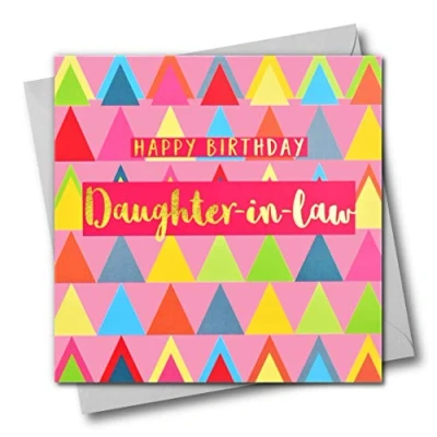 Claire Giles Greeting Cards, Happy Birthday Daughter in Law Card, Pink Triangles Design Text Foiled Shiny Gold