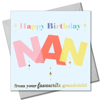 HIGH-QUALITY AND SUSTAINABLE: These 150mm x 150mm cards are printed on top quality heavy sustainable card stock. Both the greetings card & envelope are recyclable. CAPTION: Happy Birthday Nan from your Favourite Grandchild MADE IN THE UK: Designed, printed and finished in the UK, and embellished with colourful pompoms. BLANK INSIDE FOR YOUR HAND-WRITTEN MESSAGE: These cards have plenty of blank space inside, making it easy to add your own hand-written messages. ENVELOPE INCLUDED AND COMPOSTABLE POLYBAG: They come complete with a quality grey envelope, and individually wrapped in a biodegradable compostable poly bag. Can be sent with Royal Mail standard letter stamps