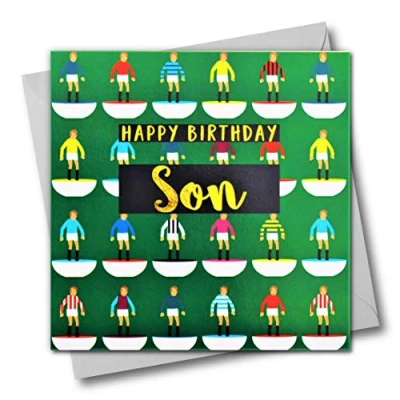 Claire Giles Greeting Cards, Happy Birthday Son Card, Footballers Design Text Foiled in Shiny Gold
