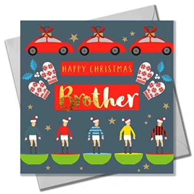 Claire Giles Greeting Cards, Happy Christmas Brother Card, Subbuteo and Cars design xmas Text Foiled in Shiny Gold