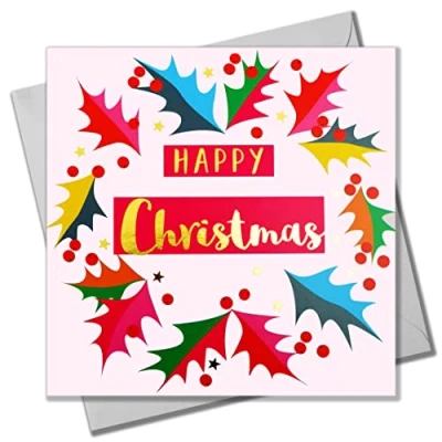 Claire Giles Greeting Cards, Happy Christmas Card, Bright Holly design xmas Text Foiled in Shiny Gold