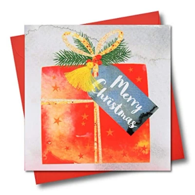 Claire Giles Greeting Cards, Happy Christmas Card, Merry Card with gift design, Embellished a Colourful Tassel