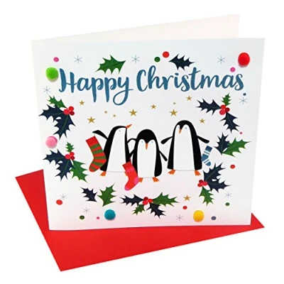 Claire Giles Greeting Cards, Happy Christmas Card, Penguins Design Xmas Embellished with Colourful Pompoms