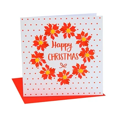 Claire Giles Greeting Cards, Happy Christmas Card, Poinsettias and dots Design Embellished with Colourful Pompoms