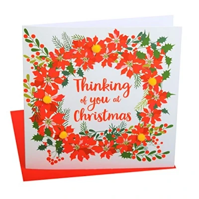 DIMENSIONS: 150x150mm CAPTION: Thinking of you at Christmas EMBELLISHMENT: Colourful Pompoms BLANK INSIDE: Space inside for your own message MADE IN THE UK: Designed, printed and finished in the UK HIGH-QUALITY: Printed on top quality heavy 350gsm card stock, with envelope included SUSTAINABLE: Comes wrapped in Compostable bag or with a card catch label. Both the greetings card & envelope are sustainably sourced and recyclable STANDARD LETTER SIZE: Can be sent with Royal Mail standard letter stamps