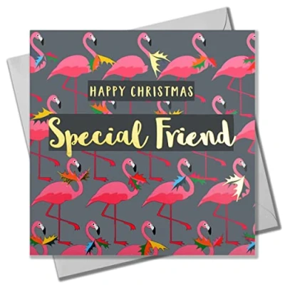 Claire Giles Greeting Cards, Happy Christmas Card, Special Friend, Flamingo's & Holly design xmas Text Foiled in Shiny Gold