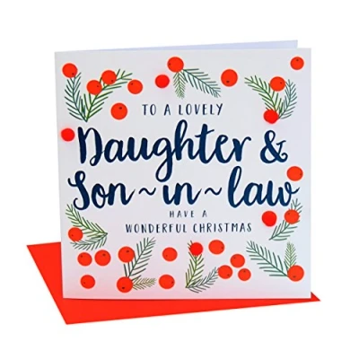 DIMENSIONS: 150x150mm CAPTION: To a Lovely Daughter & Son-in-law, have a Wonderful Christmas EMBELLISHMENT: Colourful Pompoms BLANK INSIDE: Space inside for your own message MADE IN THE UK: Designed, printed and finished in the UK HIGH-QUALITY: Printed on top quality heavy 350gsm card stock, with envelope included SUSTAINABLE: Comes wrapped in Compostable bag or with a card catch label. Both the greetings card & envelope are sustainably sourced and recyclable STANDARD LETTER SIZE: Can be sent with Royal Mail standard letter stamps