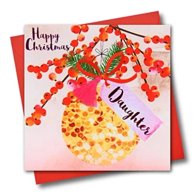 DIMENSIONS: 150x150mm CAPTION: Happy Christmas, Daughter EMBELLISHMENT: Pink Tassel BLANK INSIDE: Space inside for your own message MADE IN THE UK: Designed, printed and finished in the UK HIGH-QUALITY: Printed on top quality heavy 350gsm card stock, with envelope included SUSTAINABLE: Comes wrapped in Compostable bag or with a card catch label. Both the greetings card & envelope are sustainably sourced and recyclable STANDARD LETTER SIZE: Can be sent with Royal Mail standard letter stamps