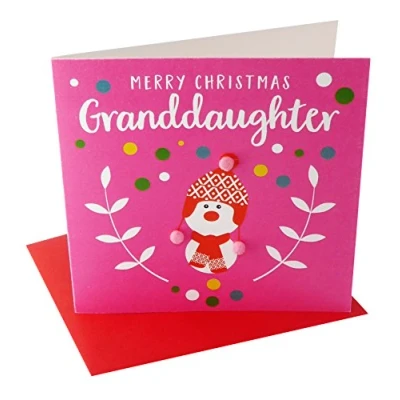 DIMENSIONS: 150x150mm CAPTION: Granddaughter EMBELLISHMENT: Colourful Pompoms BLANK INSIDE: Space inside for your own message MADE IN THE UK: Designed, printed and finished in the UK HIGH-QUALITY: Printed on top quality heavy 350gsm card stock, with envelope included SUSTAINABLE: Comes wrapped in Compostable bag or with a card catch label. Both the greetings card & envelope are sustainably sourced and recyclable STANDARD LETTER SIZE: Can be sent with Royal Mail standard letter stamps