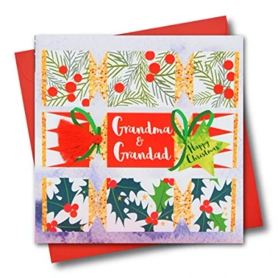 Claire Giles Greeting Cards, Happy Christmas Grandma and Grandad Card, Crackers design xmas Embellished with a Colourful Tassel