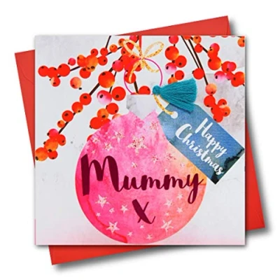 Claire Giles Greeting Cards, Happy Christmas Mummy Card, Bauble design xmas Card for Mum, Embellished with a Colourful Tassel